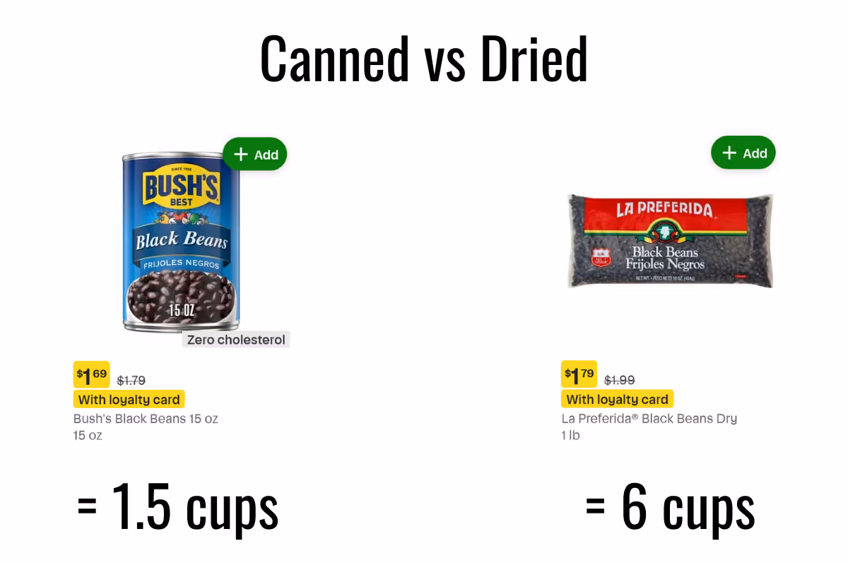 Dry beans, on the other hand, are more economical and have a better texture when cooked properly. A 1lb bag will typically yield about 6 cups of cooked beans, equal to roughly 4 cans of pre-cooked beans. This means that you can save about 50% in cost by cooking your own beans.