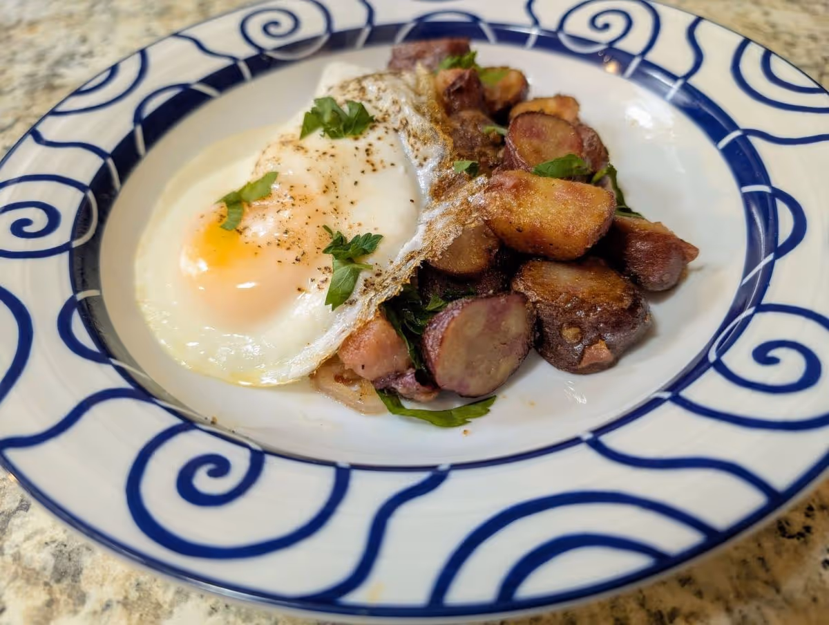 In this dish, the Ozette potatoes are sliced and crisped to golden perfection in a pan alongside savory pancetta and shallots. The dish is finished with a fried egg, its runny yolk creating a rich sauce that ties everything together. With a balance of crisp, creamy, and savory elements, this breakfast is deeply satisfying and easy to prepare, making it an excellent choice for a weekend morning or a special brunch.