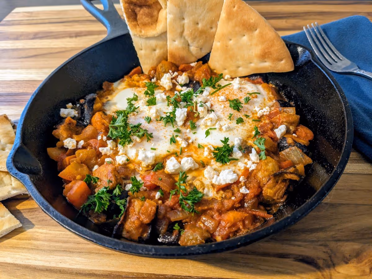 Shakshuka is a traditional Middle Eastern dish that originated in Tunisia and spread across the region. It's a popular breakfast dish, but it can also be enjoyed for brunch, lunch, or dinner. It's typically made with eggs poached in a spicy tomato sauce with onions, peppers, and spices. Roasted Eggplant Harissa Shakshuka is a variation that adds roasted eggplant and harissa paste to the sauce, creating a more complex and satisfying flavor. It's a great way to use up any leftover eggplant or harissa you have in your fridge.